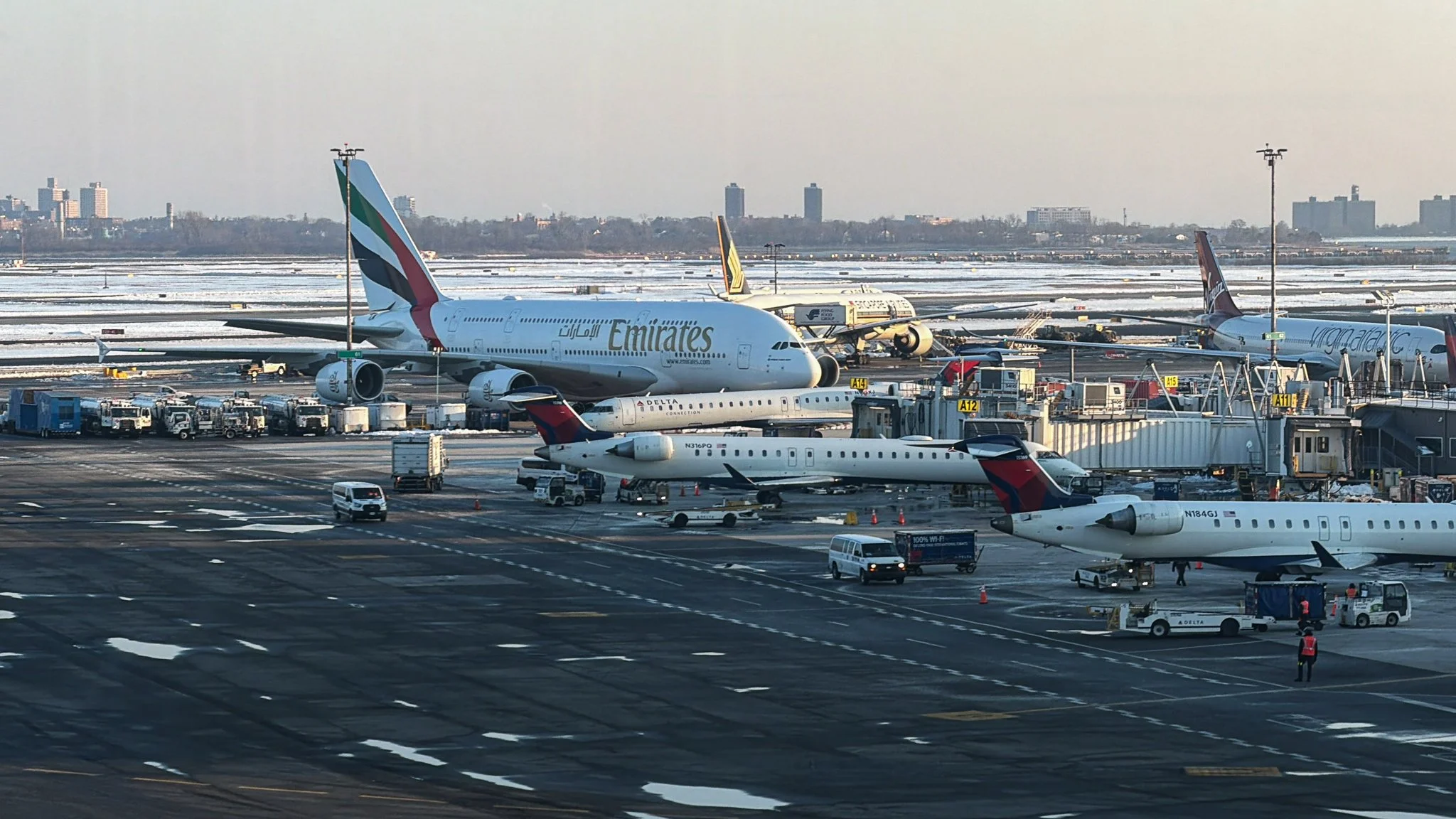 Aircraft parked at JFK Terminal 4 viewed from Howard Hughes Suite.