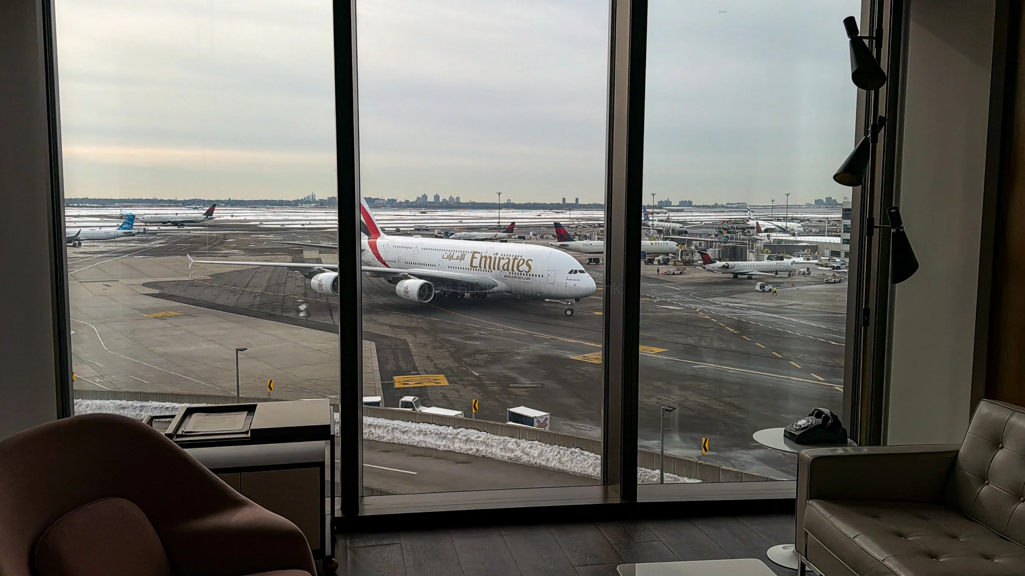 Emirates Airbus A380 viewed from Howard Hughes Suite at TWA Hotel JFK.
