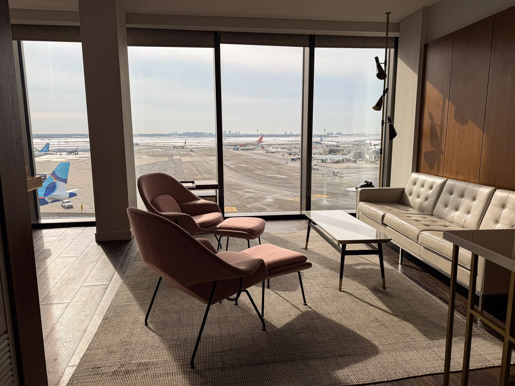 Even for guests without an aviation interest, the scale of movement outside the window is compelling. Thousands of travelers being transported through one of the busiest airports on the East Coast, viewed from a quiet, private suite, is undeniably memorable.